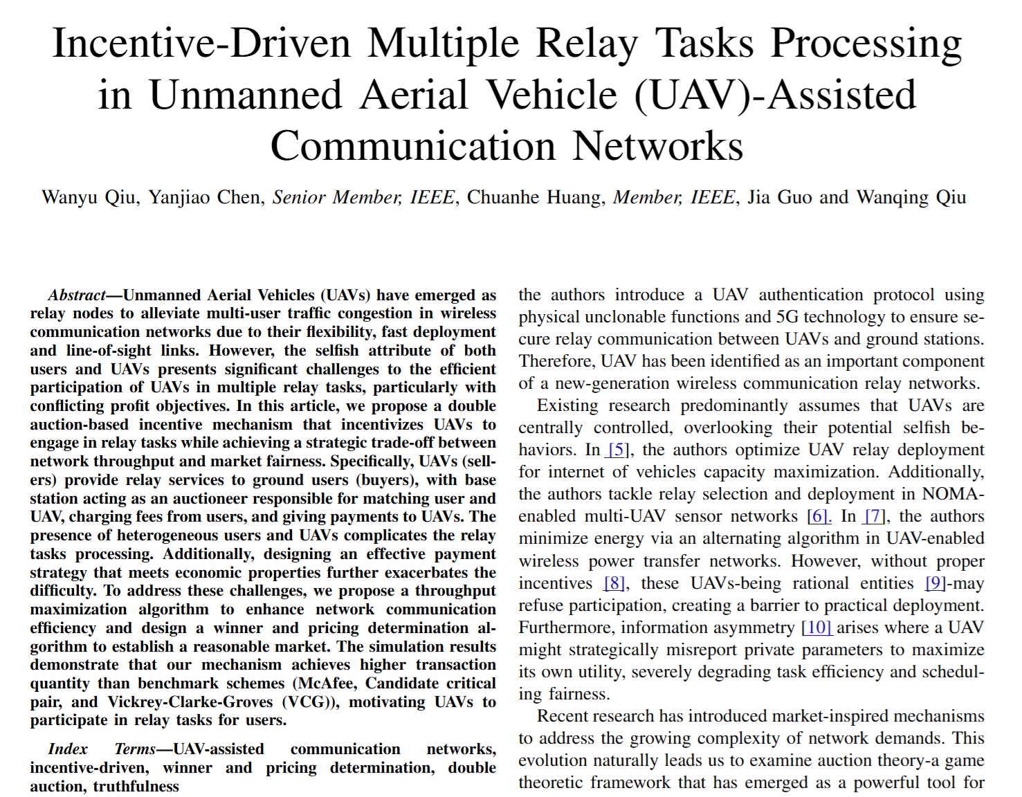 该研究提出一种基于双向拍卖理论的激励机制,实现无人机中继网络吞吐量与市场公平性的平衡。具体而言,无人机(卖方)向地面用户(买方)提供中继服务,基站作为拍卖商,匹配用户与无人机、向用户收费并向无人机支付报酬。用户与无人机的异构性增加中继任务处理的复杂度,设计满足经济属性的支付策略进一步增加了难度。为解决这些问题,该研究提出吞吐量最大化算法以提高网络通信效率,并设计定价决策构建合理公平的市场。(撰稿:邱晚玉 审核:李红艳)
