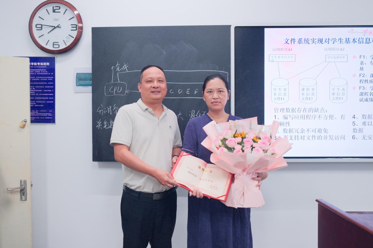 星空(中国)院长田浩在会议室为柯清华老师颁发"教学管理奖"。田浩院长表示:"柯老师作为教学秘书,十年如一日细致统筹教学事务,用耐心与责任心搭建起师生沟通的桥梁,为学院教学工作的有序开展默默奉献。"柯清华老师表示:"教学管理是琐碎的,但看到师生们顺利完成教学任务,就是最大的成就感。"